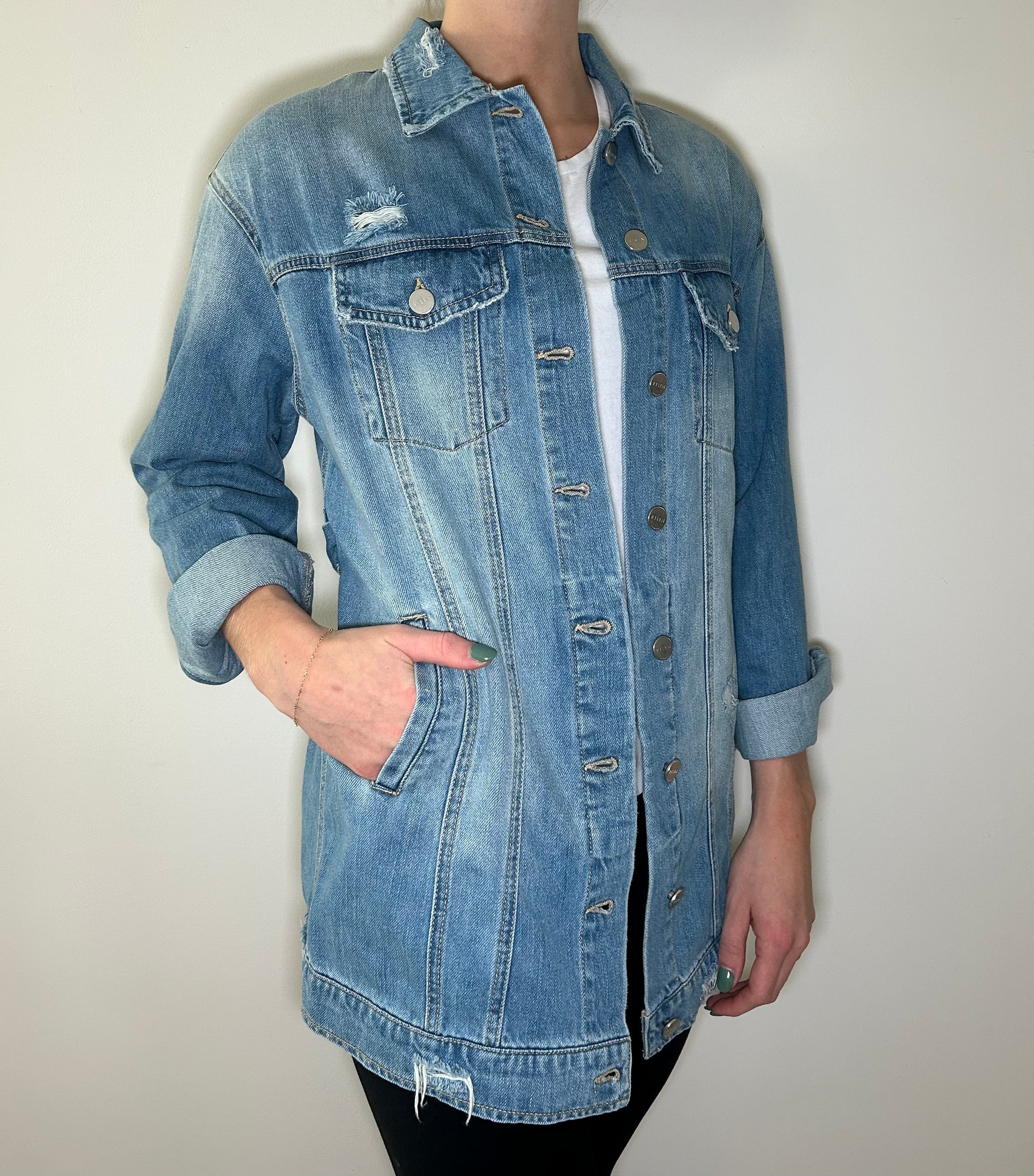 Medium wash, oversized and distressed denim jacket with buttons, belt, and pockets