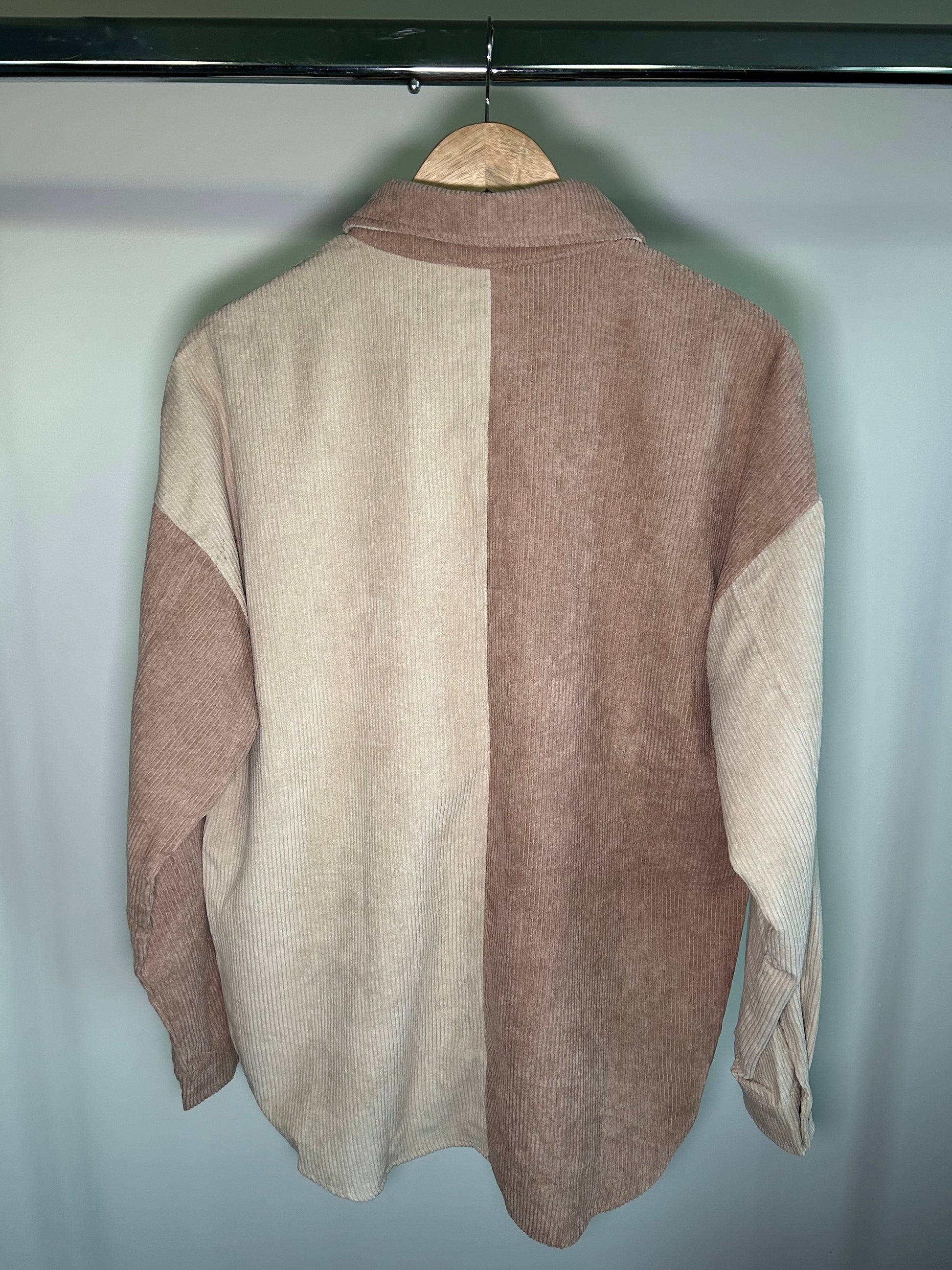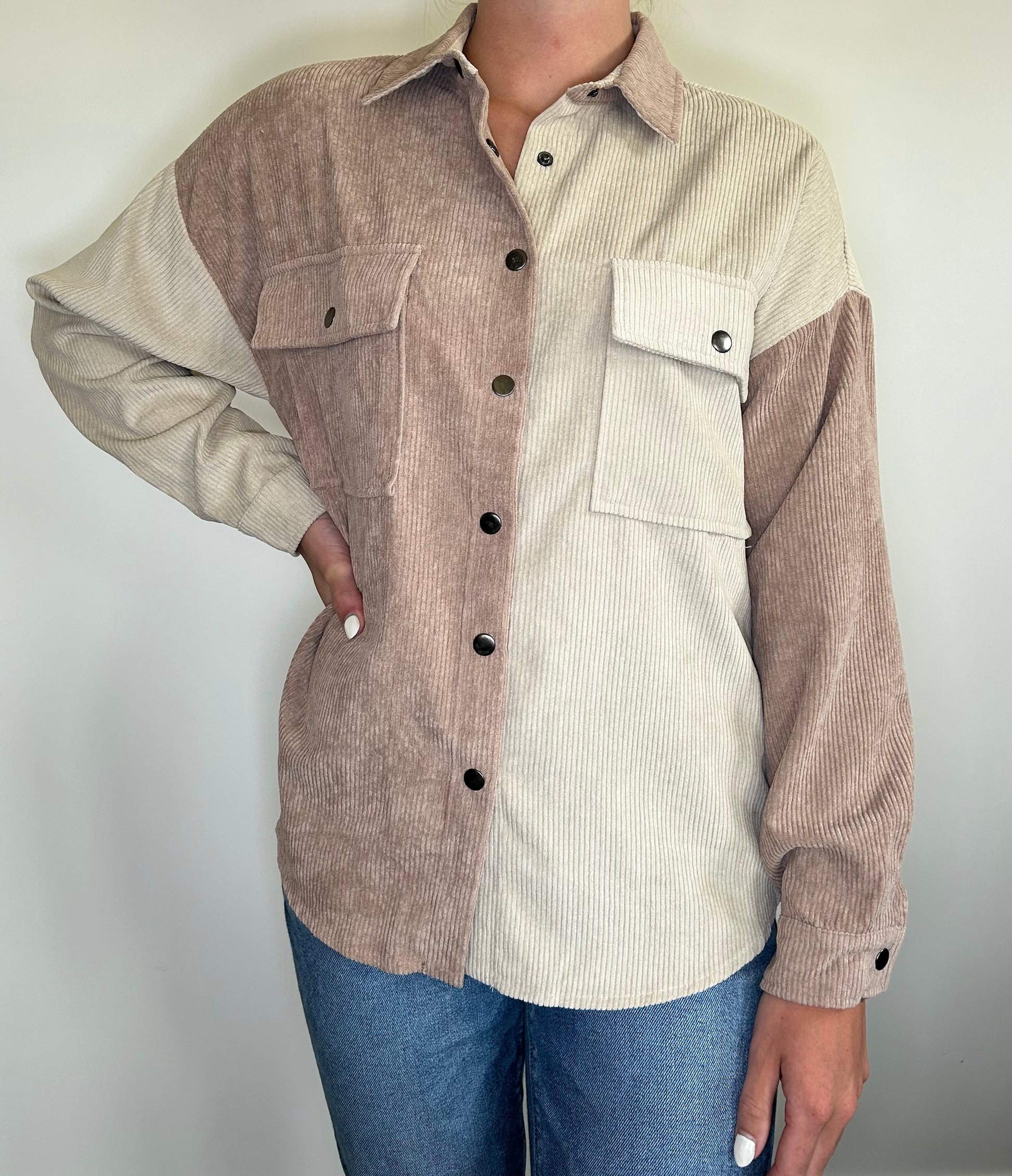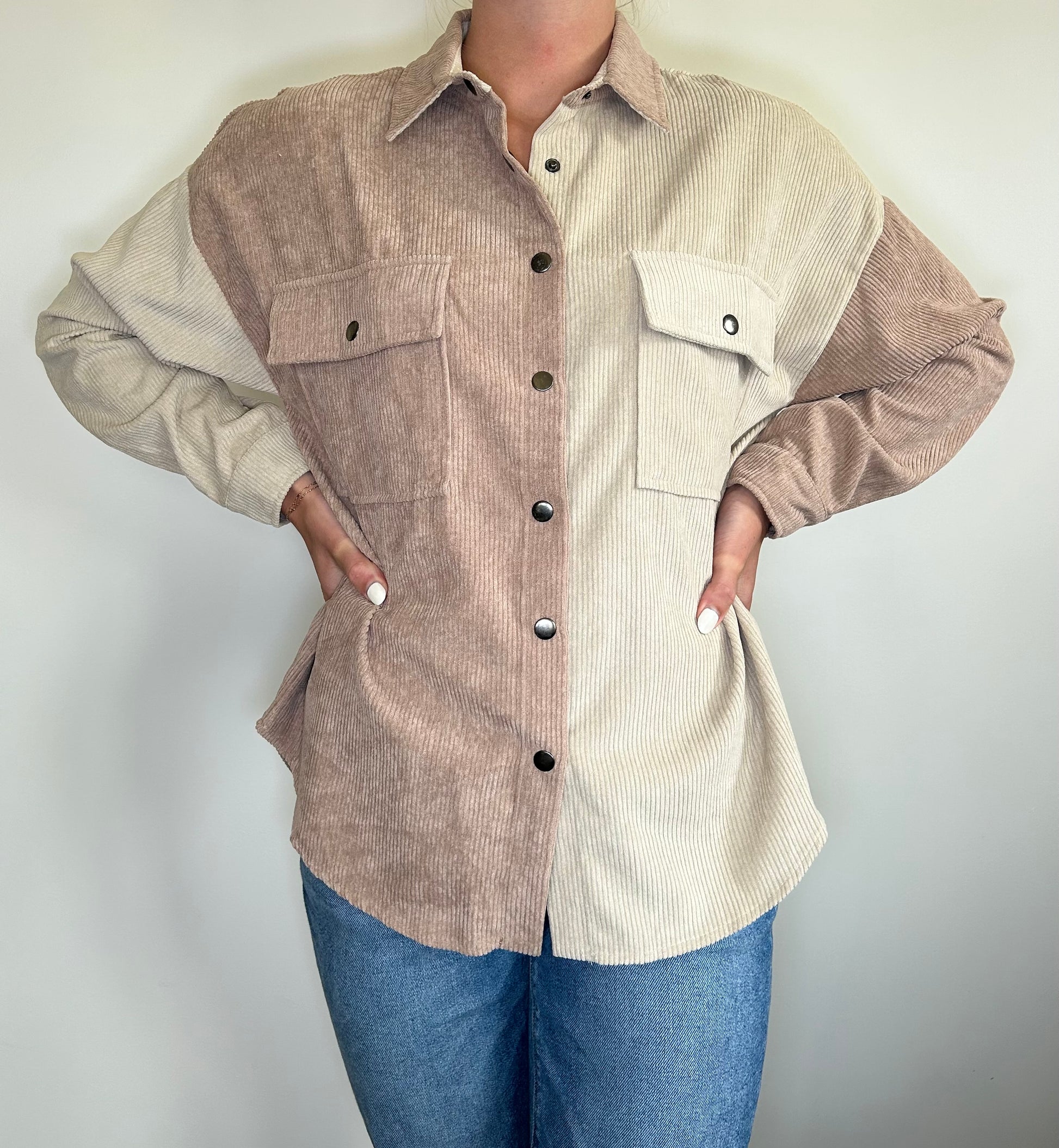 Woven corduroy, two tone color block shacket with pockets and snap closure