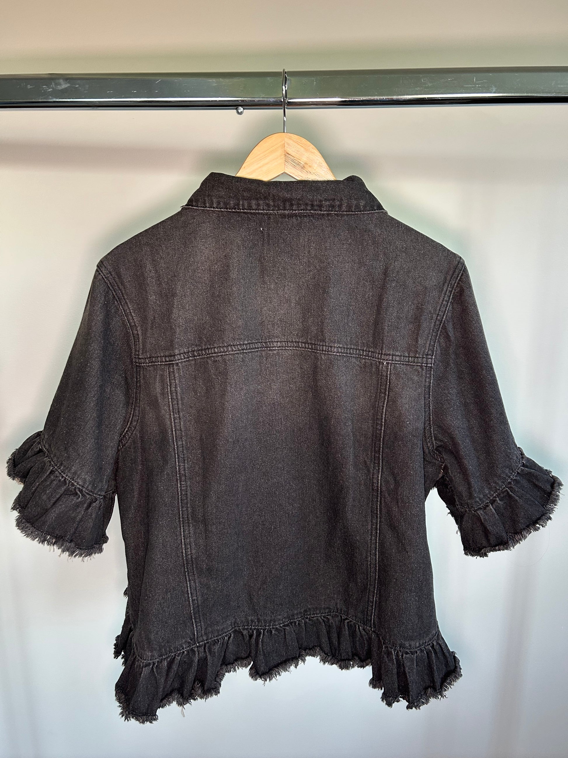 Distressed, lightweight, stone wash denim jacket, with ruffle trim