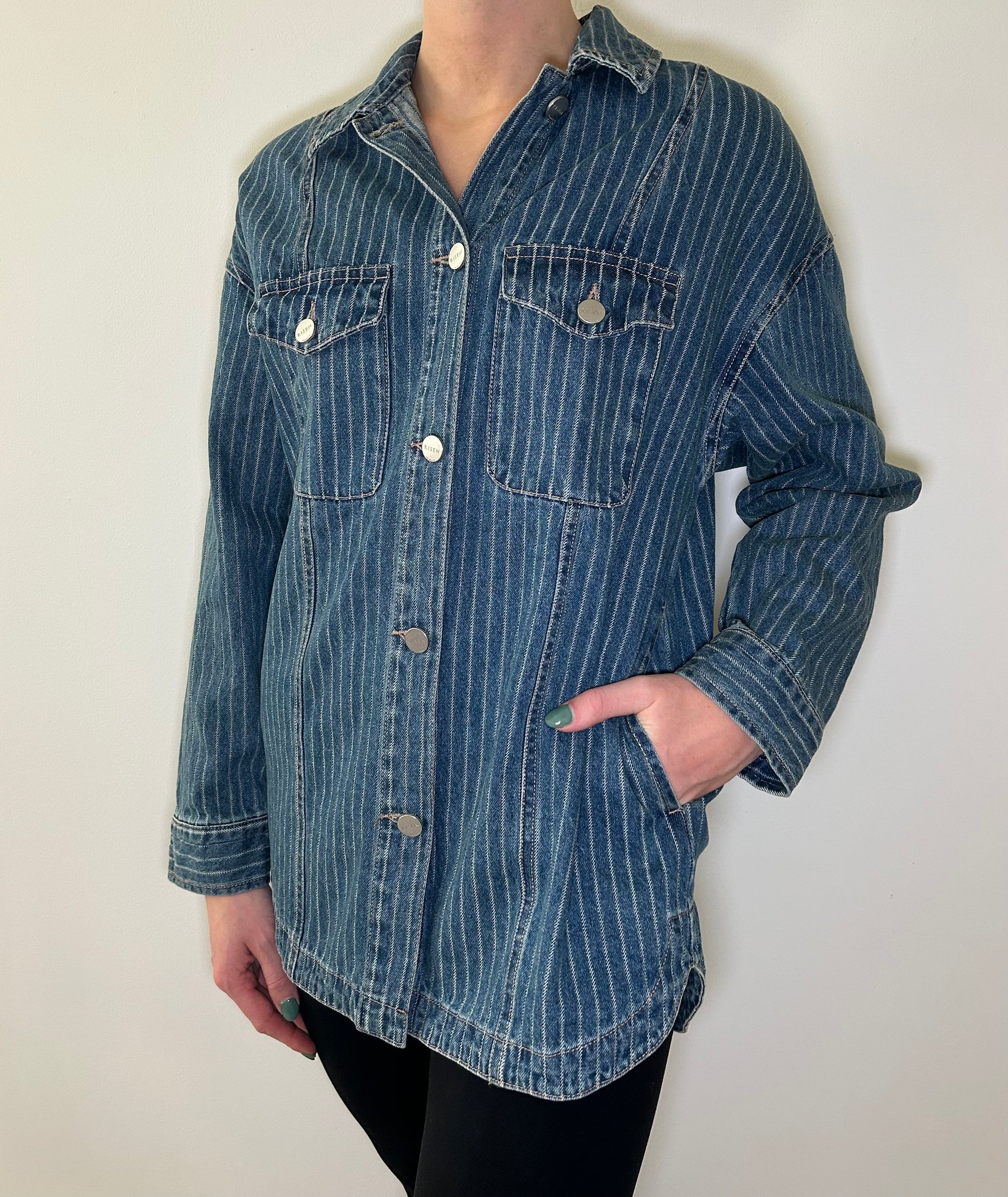 Dark wash denim shacket with buttons, threaded white pin stripes, and pockets